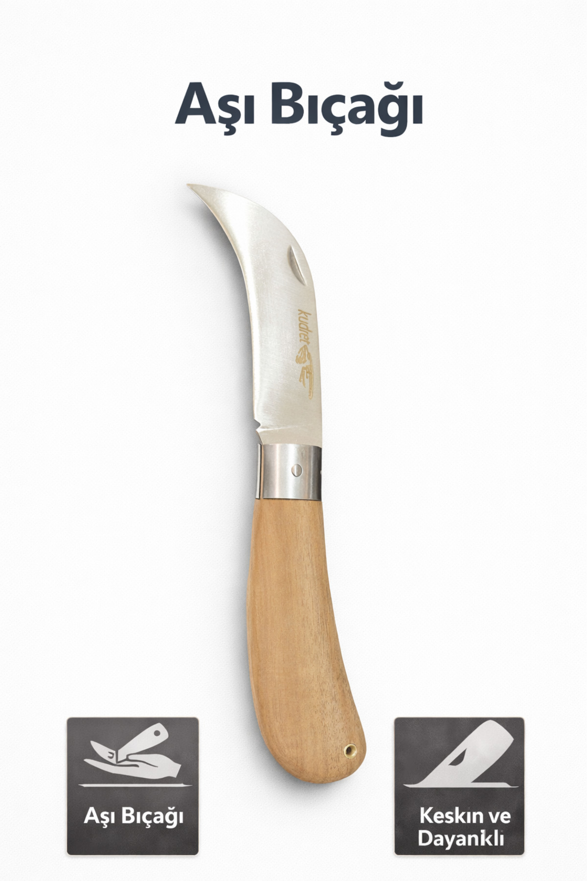 Aşı bıçağı, meyve ağaçları ve bitkilerde yapılan aşılama işlemleri için özel olarak tasarlanmıştır.; Kavisli ve keskin ağız yapısı sayesinde kabuk kaldırma, göz aşısı ve kalem aşısı gibi işlemleri kontrollü ve temiz şekilde yapmanıza olanak tanır.; El yapımı çelik bıçağı, uzun süre keskinliğini korur ve düzgün kesim sağlar.; Ergonomik ahşap sapı, elde kaymadan güvenli kullanım sunar.; Hafif ve dengeli yapısı sayesinde hem profesyonel üreticiler hem de hobi bahçıvanları için idealdir.; Bahçe bakımında hassasiyet gerektiren işlemler için tasarlanan bu aşı bıçağı, fidanlıklar, bağ ve bahçe işleri ile tarımsal üretimde güvenle kullanılabilir.; ✅ Öne Çıkan Özellikler • ✔️ Ağaç ve bitki aşılamaya özel kavisli bıçak • ✔️ Keskin ve dayanıklı çelik yapı • ✔️ El yapımı kaliteli işçilik • ✔️ Ergonomik ve sağlam ahşap sap • ✔️ Göz aşısı, kalem aşısı ve kabuk açma için ideal • ✔️ Bahçe, tarım ve fidanlık kullanımına uygun