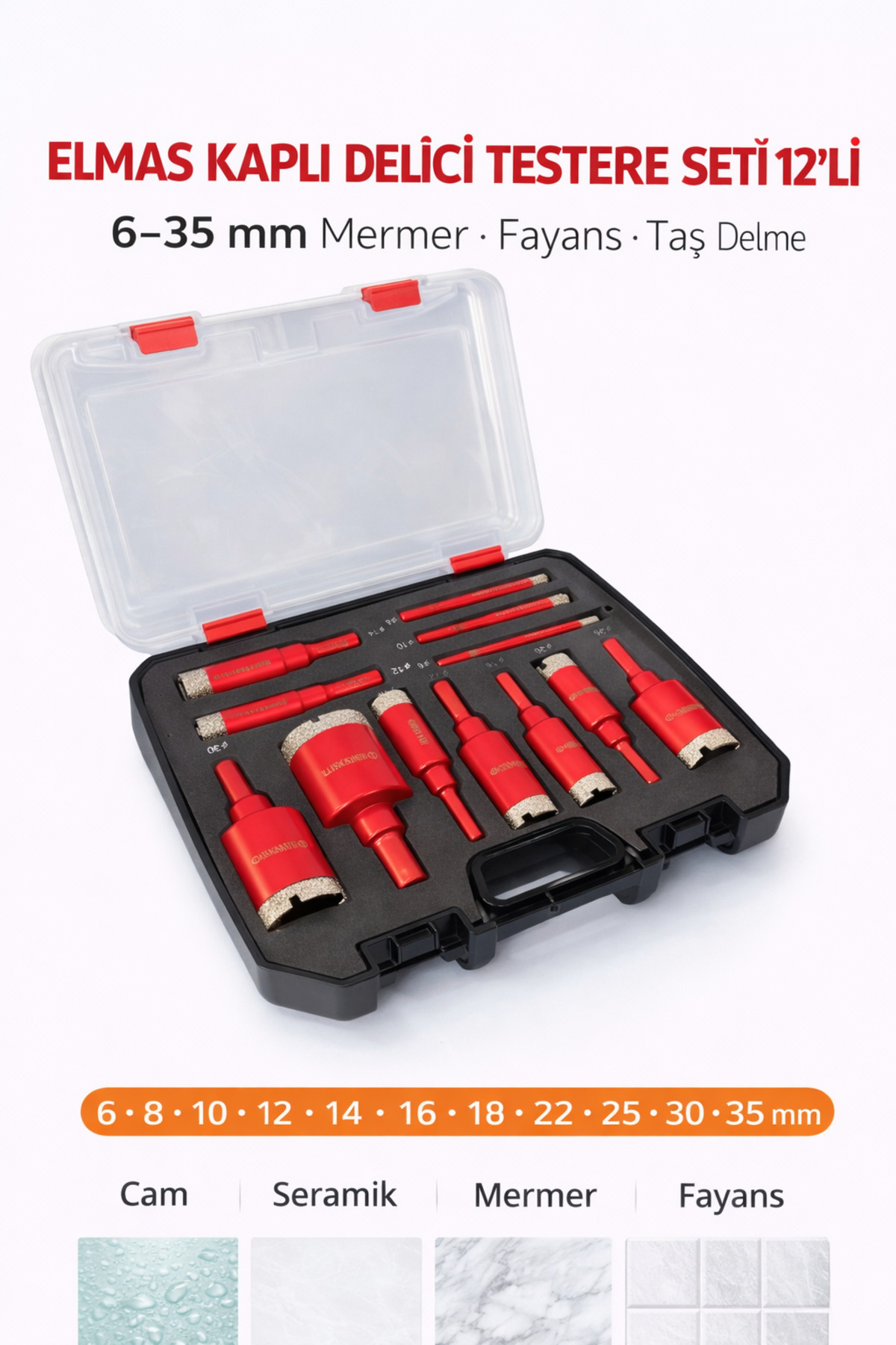Elmas Kaplı Delici Seti 12’li (Kırmızı) – Özel Kutulu 6–35 mm Cam Seramik Mermer Fayans Delme Uçları
