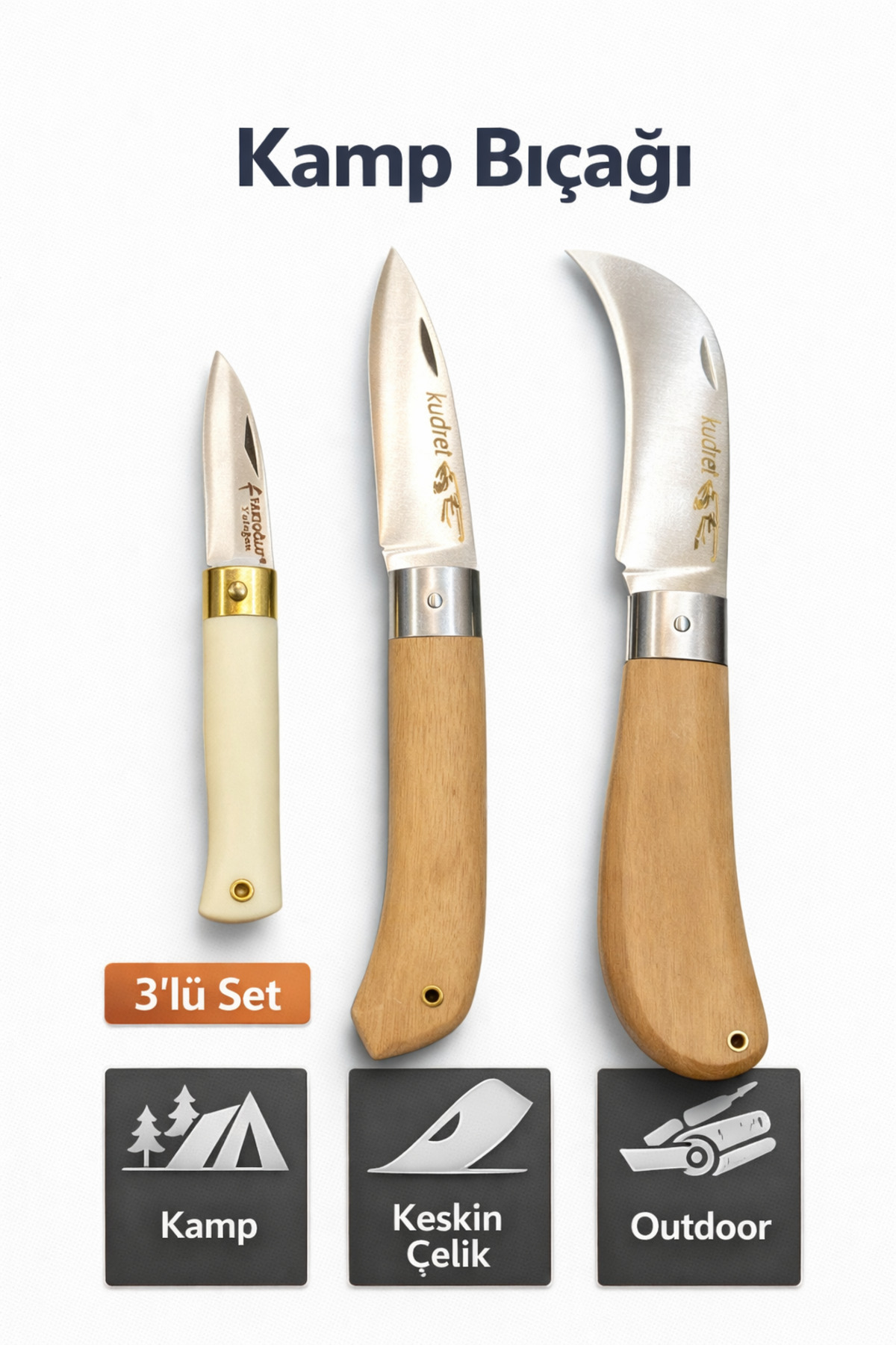 Kamp Bıçağı Seti 3’lü, doğa, kamp ve outdoor kullanımlar için farklı boyutlarda tasarlanmış keskin ve dayanıklı bıçaklardan oluşur.; Set içerisinde yer alan küçük, orta ve büyük boy bıçaklar; kamp sırasında ihtiyaç duyulan tüm kesme işlemleri için pratik çözümler sunar.; Keskin çelik ağız yapısı sayesinde ip kesme, dal temizleme, odun hazırlama ve genel kamp işlerinde kontrollü ve güvenli kullanım sağlar.; Ergonomik ahşap ve krem saplı tasarımı, elde rahat tutuş sunar ve uzun süreli kullanımlarda konfor sağlar.; El yapımı işçiliğiyle öne çıkan bu kamp bıçakları, kampçılar, doğa yürüyüşçüleri ve outdoor tutkunları için ideal bir settir.; Farklı boy avantajı sayesinde tek ürünle çok amaçlı kullanım imkânı sunar.; ✅ Öne Çıkan Özellikler • ✔️ 3 farklı boy kamp bıçağı • ✔️ Keskin ve dayanıklı çelik ağız • ✔️ El yapımı kaliteli işçilik • ✔️ Ergonomik ahşap ve krem sap • ✔️ Kamp, doğa, piknik ve outdoor kullanımına uygun • ✔️ Çok amaçlı ve pratik set